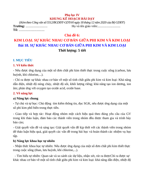 Giáo án Bài 18 KHTN 9 Cánh Diều (2024): Sự khác nhau cơ bản giữa phi kim và kim loại