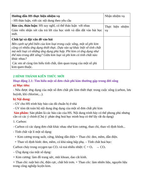 Hoạt động 2.1: Tìm hiểu một số đơn chất phi kim thường gặp trong đời sống a) Mục tiêu: