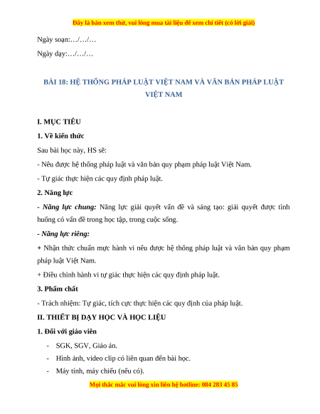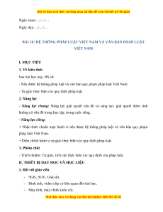 BÀI 18: HỆ THỐNG PHÁP LUẬT VIỆT NAM VÀ VĂN BẢN PHÁP LUẬT VIỆT NAM I. MỤC TIÊU 1. Về kiến thức Sau bài học này, HS sẽ: