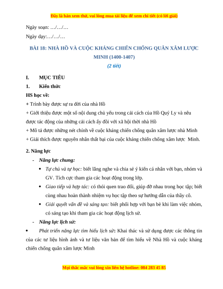 BÀI 18: NHÀ HỒ VÀ CUỘC KHÁNG CHIẾN CHỐNG QUÂN XÂM LƯỢC MINH (1400-1407) (2 tiết) I. MỤC TIÊU 1. Kiến thức HS học về: