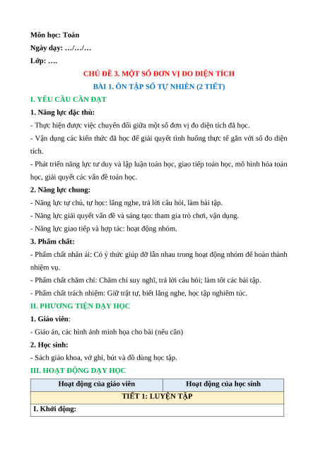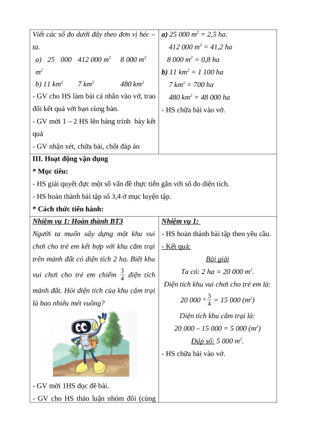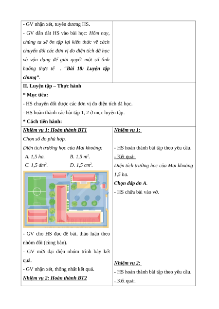 - Vận dụng các kiến thức đã học để giải quyết tình huống thực tế gắn với số đo diện tích.