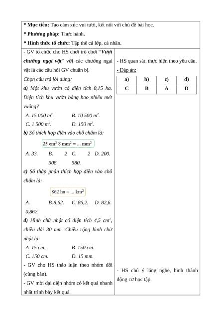 - HS chuyển đổi được các đơn vị đo diện tích đã học.