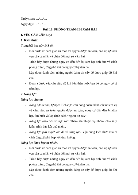 - Đưa ra được yêu cầu giúp đỡ khi bản thân hoặc bạn bè có nguy cơ bị xâm hại. 2. Năng lực: