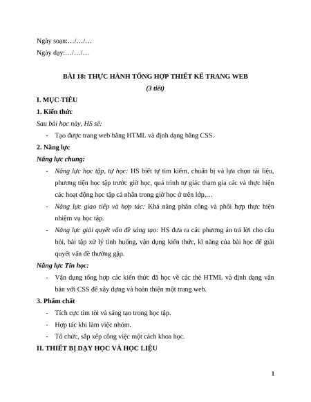 BÀI 18: THỰC HÀNH TỔNG HỢP THIẾT KẾ TRANG WEB (3 tiết) I. MỤC TIÊU 1. Kiến thức