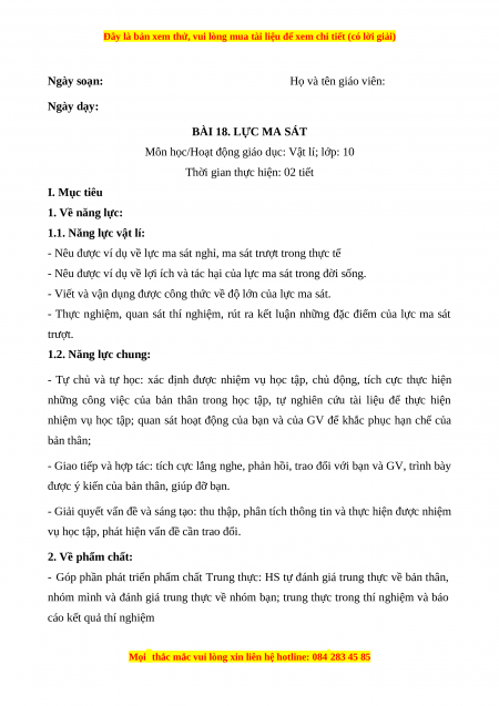 Ngày soạn: Họ và tên giáo viên: Ngày dạy: BÀI 18. LỰC MA SÁT