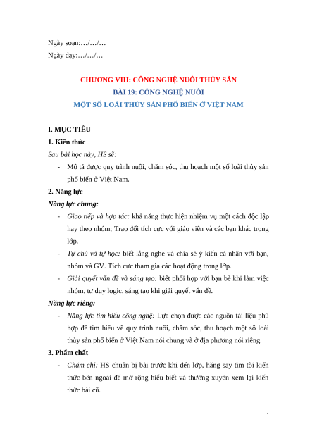 - Mô tả được quy trình nuôi, chăm sóc, thu hoạch một số loài thủy sản phổ biến ở Việt Nam. 2. Năng lực