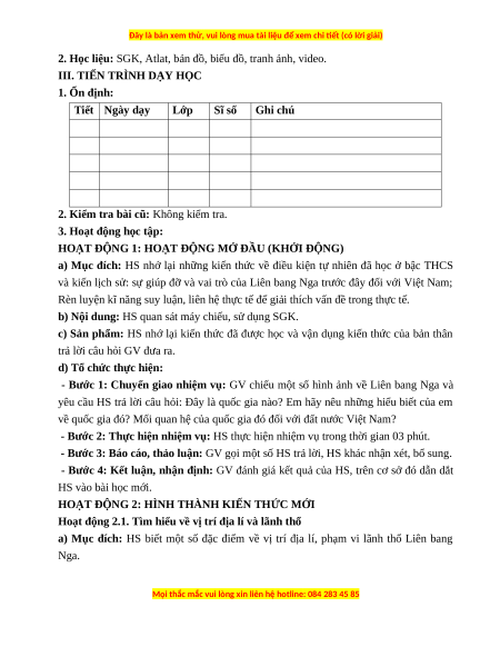DÂN CƯ VÀ XÃ HỘI LIÊN BANG NGA I. MỤC TIÊU 1. Kiến thức: