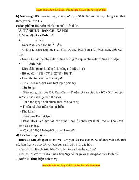 được vị trí, điều kiện tự nhiên và dân cư - xã hội của Liên Bang Nga.