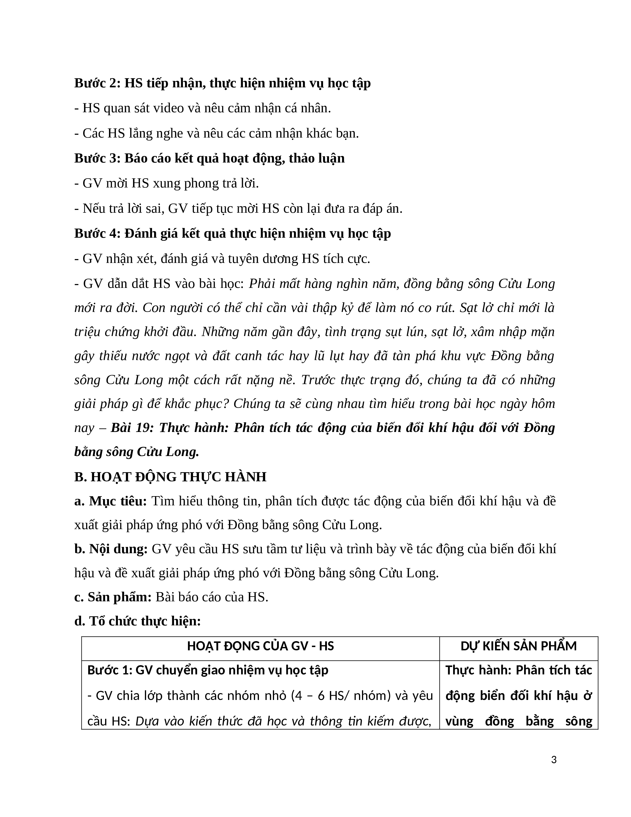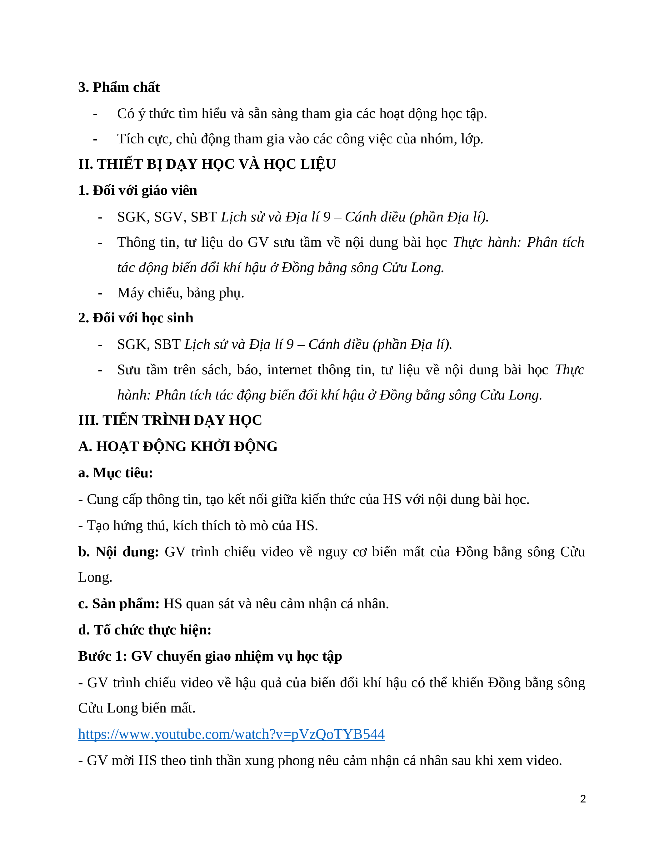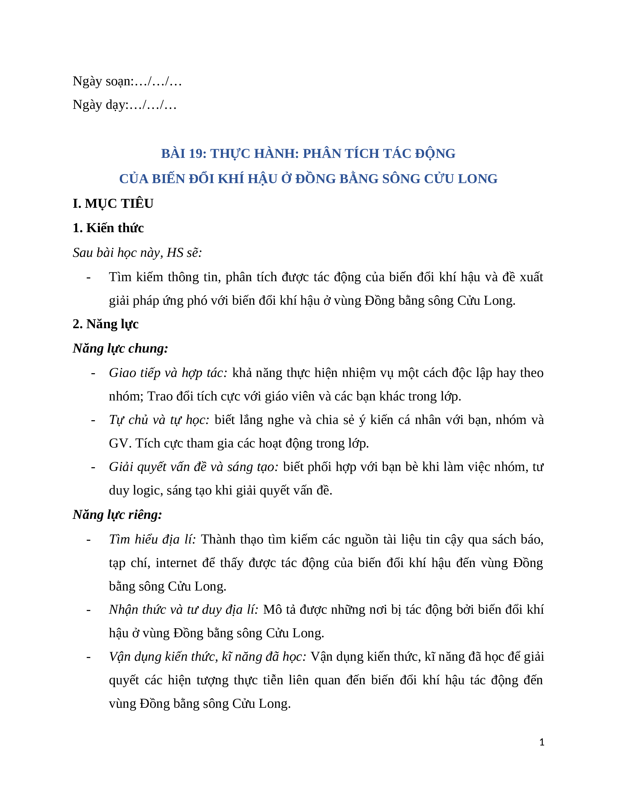 CỦA BIẾN ĐỔI KHÍ HẬU Ở ĐỒNG BẰNG SÔNG CỬU LONG I. MỤC TIÊU 1. Kiến thức