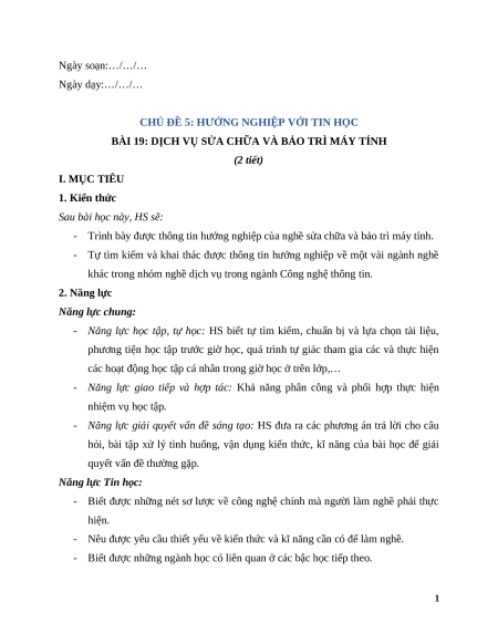 BÀI 19: DỊCH VỤ SỬA CHỮA VÀ BẢO TRÌ MÁY TÍNH (2 tiết) I. MỤC TIÊU 1. Kiến thức