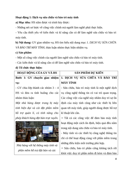 Hoạt động 1: Dịch vụ sửa chữa và bảo trì máy tính