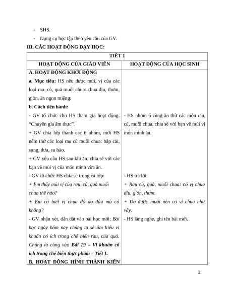 loại rau, củ, quả muối chua: chua dịu, thơm, giòn, ăn ngon miệng. b. Cách tiến hành: