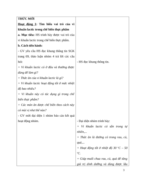 - Trình bày được một đến hai ví dụ về việc sử dụng vi khuẩn có ích trong chế biến thực phẩm. 3. Phẩm chất: