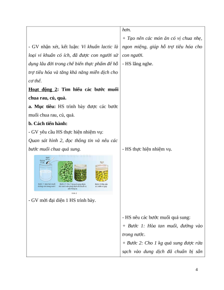a. Mục tiêu: HS trình bày được các bước muối chua rau, củ, quả. b. Cách tiến hành: