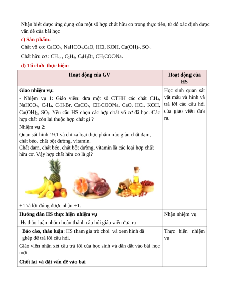 Nhận biết được ứng dụng của một số hợp chất hữu cơ trong thực tiễn, từ đó xác định được vấn đề của bài học c) Sản phẩm:
