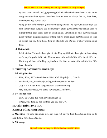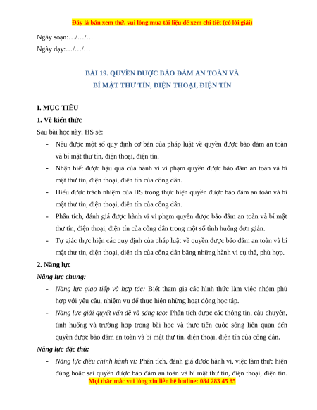 Giáo án Bài 19 KTPL 11 Cánh diều: Quyền được bảo đảm an toàn và bí mật thư tín, điện thoai, điện tín