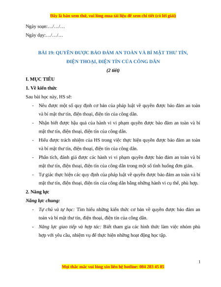Giáo án Bài 19 KTPL 11 Kết nối tri thức: Quyền được đảm bảo an toàn và bí mật thư tín, điện thoại, điện tín của công dân