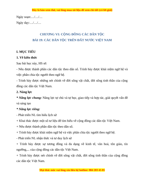 BÀI 19: CÁC DÂN TỘC TRÊN ĐẤT NƯỚC VIỆT NAM I. MỤC TIÊU 1. Về kiến thức Sau bài học này, HS sẽ:
