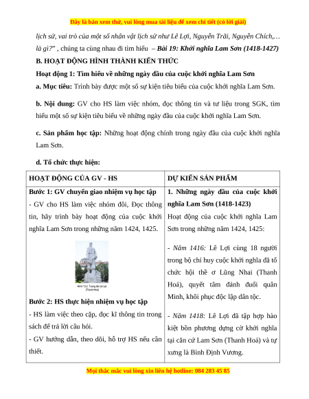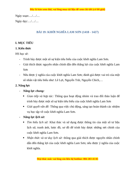 BÀI 19: KHỞI NGHĨA LAM SƠN (1418 - 1427) I. MỤC TIÊU 1. Kiến thức HS học sẽ: