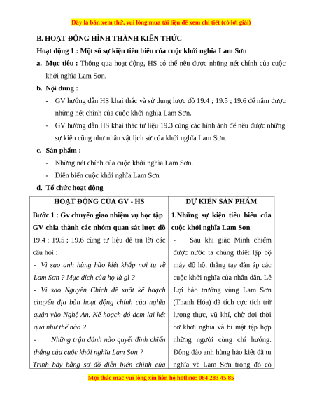 a. Mục tiêu : Thông qua hoạt động, HS có thể nêu được những nét chính của cuộc khởi nghĩa Lam Sơn. b. Nội dung :