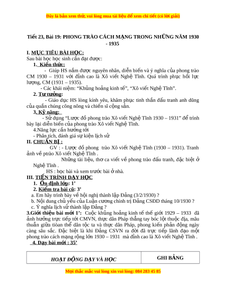 ế 23, Bài 19: PHONG TRÀO CÁCH M N Ạ G TRONG NH N Ữ G NĂM 1930 - 1935 I. M C Ụ TIÊU BÀI H C Ọ : Sau bài h c ọ h c s ọ inh c n đ ầ t ạ đư c: ợ 1. Ki n t ế h c: ứ - Giúp HS n m ắ đư c ợ nguyên nhân, di n ễ bi n ế và ý nghĩa c a ủ phong trào CM 1930 – 1931 v i ớ đ nh ỉ cao là Xô vi t