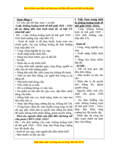 Đây là bản xem th , vu ử i lòng mua tài li u ệ đ xe ể m chi ti t (c ế ó l i ờ gi i ả ) Hoạt đ ng 1 ộ : I. Vi t ệ Nam trong th i ờ GV yêu cầu HS đ c m ọ c ụ 1 và h i ỏ : kì kh ng ủ ho ng ả kinh tế Cu c ộ kh ng ủ ho ng ả kinh t ế th ế gi i