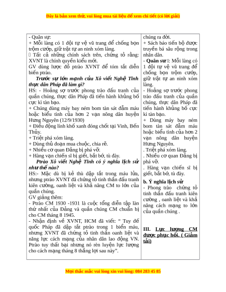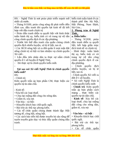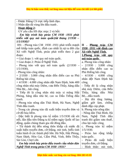 Đây là bản xem th , vu ử i lòng mua tài li u ệ đ xe ể m chi ti t (c ế ó l i ờ gi i ả ) HS: - Nghệ Tĩnh là n i ơ ptrào phát tri n ể m nh ạ mẽ bi u ể tình tu n hành ầ ở các nhất cả nư c. ớ thành phố l n: ớ Hà N i ộ ,