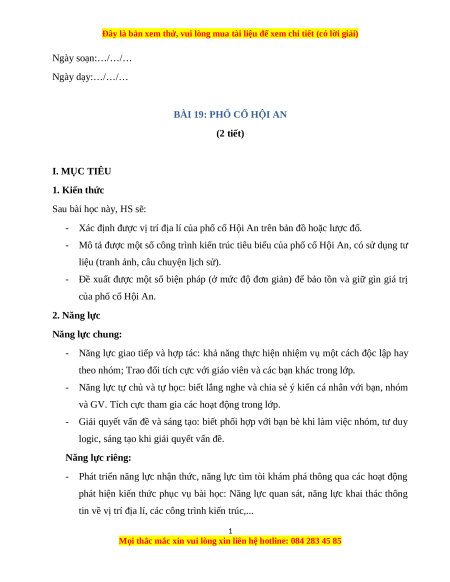 BÀI 19: PHỐ CỔ HỘI AN (2 tiết) I. MỤC TIÊU 1. Kiến thức Sau bài học này, HS sẽ: