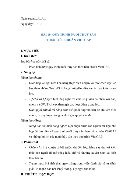 - Phân tích được quy trình nuôi thủy sản theo tiêu chuẩn VietGAP. 2. Năng lực