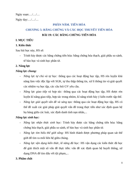 BÀI 19: CÁC BẰNG CHỨNG TIẾN HÓA I. MỤC TIÊU 1. Kiến thức Sau bài học này, HS sẽ: