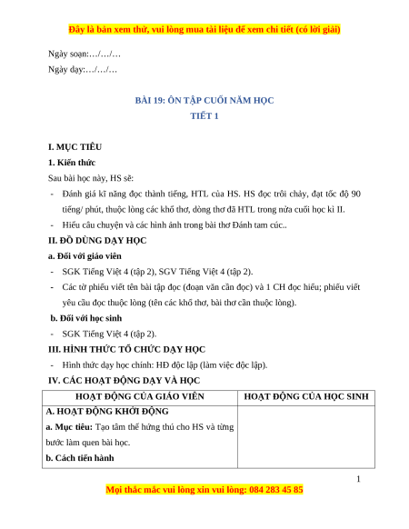 BÀI 19: ÔN TẬP CUỐI NĂM HỌC TIẾT 1 I. MỤC TIÊU 1. Kiến thức Sau bài học này, HS sẽ: