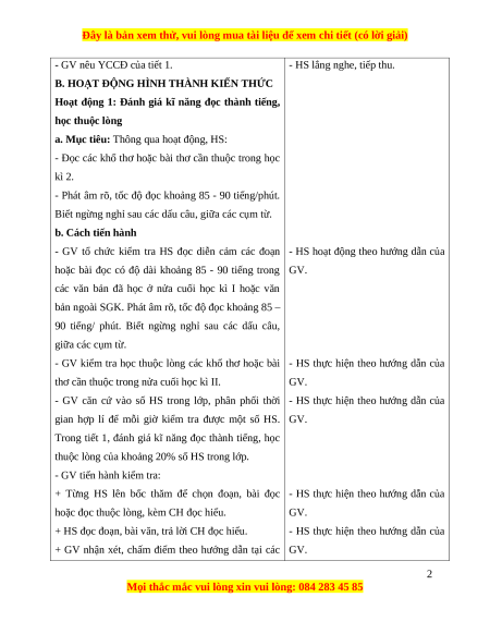 tiếng/ phút, thuộc lòng các khổ thơ, dòng thơ đã HTL trong nửa cuối học kì II.