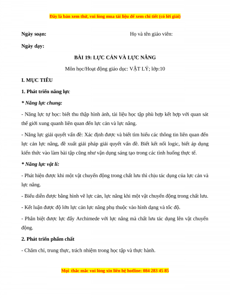 Giáo án Bài 19 Vật lí 10 Kết nối tri thức (2024): Lực cản và lực nâng