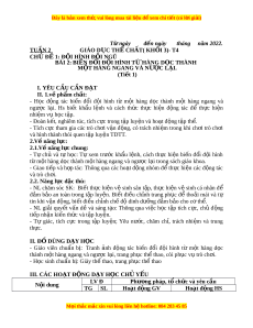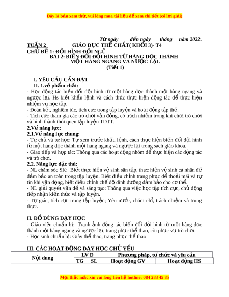 và hình thành thói quen t p ậ luy n ệ TDTT. 2.V năng l ề c: ự 2.1.V năng l ề c chung ự : - Tự chủ và tự h c: ọ Tự xem trư c ớ kh u ẩ l nh, ệ cách th c ự hi n ệ bi n ế đ i ổ đ i ộ hình t m ừ t ộ hàng d c t ọ hành m t ộ hàng ngang và ngư c l ợ i ạ trong sách giáo khoa. - Giao ti p ế và h p ợ tác: Thông qua các ho t ạ đ ng ộ nhóm đ t ể h c ự hi n ệ các đ ng ộ tác và trò ch i ơ . 2.2. Năng l c đ ự c t ặ hù: - NL chăm sóc SK: Bi t ế th c ự hi n ệ v ệ sinh sân t p, ậ th c ự hi n ệ v ệ sinh cá nhân để đ m ả b o ả an toàn trong t p ậ luy n. ệ Bi t ế đi u ề ch nh ỉ trang ph c ụ đ ể tho i ả mái và tự tin khi v n ậ đ ng, bi ộ t ế đi u ch ề nh ch ỉ đ ế di ộ nh dư ng ỡ đ m ả b o ả cho c t ơ h . ể - NL gi i ả quy t ế v n ấ dề và sáng t o: ạ Thông qua vi c ệ h c ọ t p ậ tích c c, ự ch ủ đ ng ộ ti p nh ế n ậ ki n t ế h c và t ứ p ậ luy n. ệ - Tự giác, tích c c ự trong t p ậ luy n; ệ Yêu nư c, ớ chăm ch ,ỉ trách nhi m ệ và trung th c. ự II. Đ D Ồ ÙNG D Y Ạ H C Ọ - Giáo viên chu n ẩ b : ị Tranh nh ả đ ng ộ tác bi n ế đ i ổ đ i ộ hình từ m t ộ hàng d c ọ thành m t ộ hàng ngang và ngư c ợ l i ạ , trang ph c ụ th t ể hao, còi ph c v ụ ụ trò ch i ơ . - H c s ọ inh chu n b ẩ :