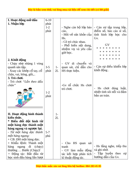Đây là bản xem th , vu ử i lòng mua tài li u ệ đ xe ể m chi ti t (c ế ó l i ờ gi i ả ) I. Hoạt đ ng m ộ đ ở u ầ 6-10 1. Nhận l p ớ phút 1-2 - Nghe cán bộ l p ớ báo - Cán sư t p ậ trung l p, ớ phút cáo. đi m ể số, báo cáo sĩ s , ố - H i ỏ về s c ứ kh e ỏ c a ủ tình hình l p ớ h c ọ cho Hs. Gv. - Cô trò chúc nhau. - Phổ bi n ế n i ộ dung, GV nhi m ệ vụ và yêu c u ầ * * * * * * * * gi h ờ c. ọ * * * * * * * * * * * * * * 2. Kh i ở đ ng ộ * * * * * * * - Ch y ạ nhẹ nhàng 1 vòng - GV di chuy n ể và quanh sân t p. ậ 3-5 1- quan sát, chỉ d n ẫ cho - Cán sự đi u ề khi n ể l p ớ - Xoay các kh p c ớ ổ tay, cổ phút 2L HS th c hi ự n. ệ kh i ở đ ng ộ . chân, vai, hông, gối,.. 3. Trò ch i ơ . - Trò ch i ơ “L n ầ theo d u ấ chân” -Gv tổ ch c ứ Hs ch i ơ trò ch i ơ . - Hs ch i ơ đúng lu t ậ , 1-2 nhiệt tình sôi n i ổ và đ m ả phút b o ả an toàn. II. Hoạt đ ng ộ hình thành 1- ki n t ế h c. ứ 2L * Bi n ế đ i ổ đ i ộ hình từ m t ộ hàng d c ọ thành m t ộ
