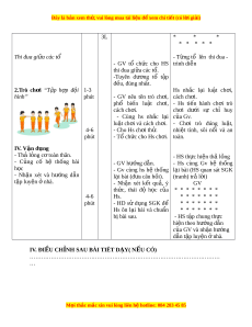 Đây là bản xem th , vu ử i lòng mua tài li u ệ đ xe ể m chi ti t (c ế ó l i ờ gi i ả ) 3L * * * * * * * * Thi đua gi a ữ các t ổ - T ng t ừ ổ lên thi đua - - GV tổ ch c ứ cho HS trình di n ễ thi đua gi a các ữ tổ. -Tuyên dư ng ơ tổ t p ậ đ u, đúng nh ề ất. 2.Trò ch i ơ “T p ậ h p ợ đ i ộ 1-3 Hs nh c ắ l i ạ lu t ậ ch i ơ , hình” phút - GV nêu tên trò ch i ơ , cách ch i ơ . phổ bi n ế lu t ậ ch i ơ , - Hs ti n ế hành ch i ơ trò cách ch i ơ . ch i ơ dư i ớ sự chỉ huy - Cùng hs nh c ắ l i ạ c a ủ Gv. lu t ậ ch i ơ và cách ch i ơ . - Ch i ơ trò đúng lu t ậ , 4-6 - Cho Hs ch i ơ th . ử nhiệt tình, sôi n i ổ và an phút - Tổ ch c ứ cho Hs ch i ơ . toàn. IV. Vận dụng - Thả l ng c ỏ t ơ oàn thân. - HS th c hi ự n t ệ h l ả ng ỏ - C ng ủ cố hệ th ng ố bài - GV hư ng d ớ ẫn. - Hs cùng Gv hệ th ng ố h c ọ - Gv cùng hs hệ th ng ố l i ạ bài (HS quan sát SGK - Nh n ậ xét và hư ng ớ d n ẫ l i ạ bài (đ a câu h ư i ỏ ). (tranh) tr l ả i ờ ) t p l ậ uyện nhà. ở - Nh n ậ xét k t ế qu , ả ý GV th c, ứ thái độ h c ọ c a ủ * * * * * * * * 4-6 Hs. * * * * * * * phút - HD sử d ng ụ SGK để * * * * * * * Hs ôn l i ạ bài và chu n ẩ * * * * * * * bị bài sau. - HS t p chung t ậ h c ự hiện theo hư ng ớ d n ẫ c a ủ GV và nh n h ậ ư ng ớ dẫn t p l ậ uy n ệ nhà. ở IV. ĐIỀU CH N