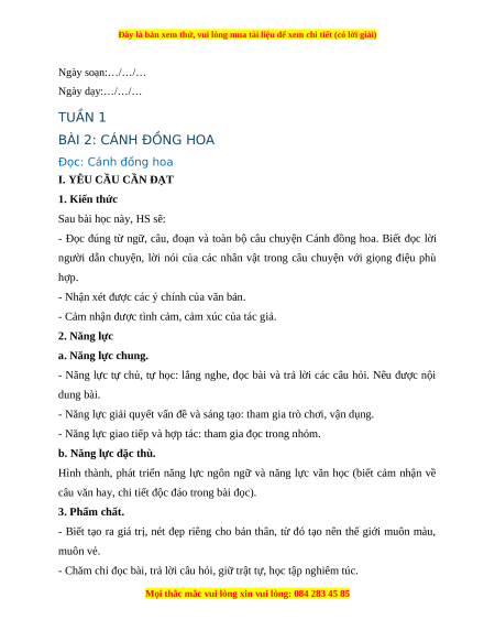 Ngày soạn:…/…/… Ngày dạy:…/…/… TUẦN 1 BÀI 2: CÁNH ĐỒNG HOA Đọc: Cánh đồng hoa