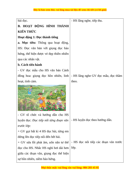 đồng hoa: giọng đọc hồn nhiên, linh - HS lắng nghe GV đọc mẫu, đọc thầm hoạt, tình cảm. theo.
