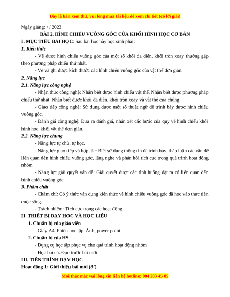 Giáo án Bài 2 Công nghệ 8 Cánh diều: Hình chiếu vuông góc của khối hình học cơ bản