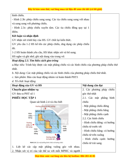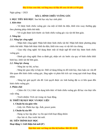 Giáo án Bài 2 Công nghệ 8 Chân trời sáng tạo: Hình chiếu vuông góc