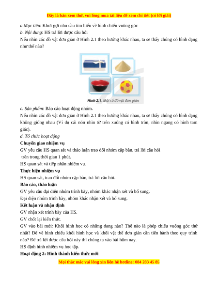 - Năng lực giải quyết vấn đề: Giải quyết được các tình huống đặt ra có liên quan đến hình chiếu vuông góc. 3. Phẩm chất