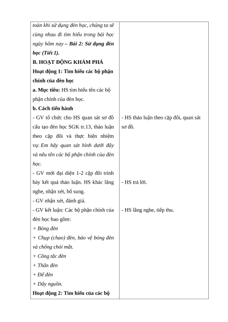 phận chính của đèn học. b. Cách tiến hành