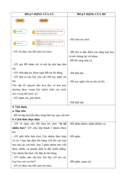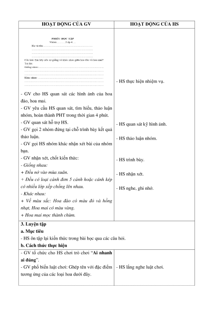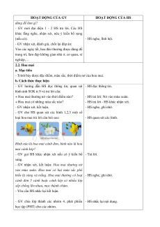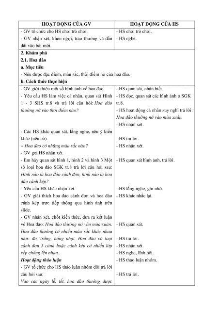 - GV nhận xét, khen ngợi, trao thưởng và dẫn - HS nghe. dắt vào bài mới. 2. Khám phá 2.1. Hoa đào a. Mục tiêu