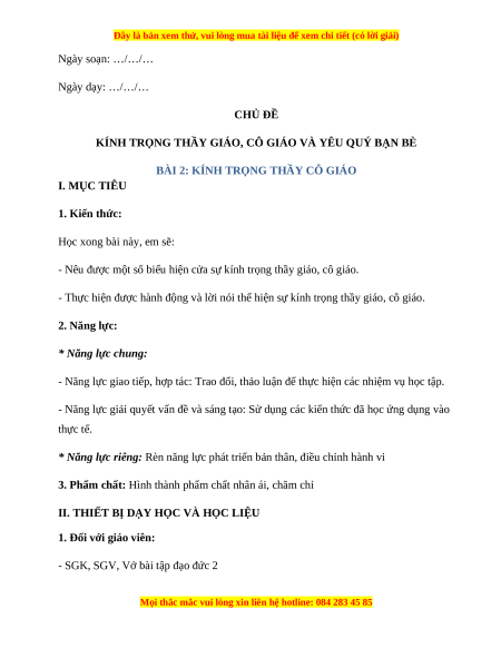 - Thực hiện được hành động và lời nói thể hiện sự kính trọng thầy giáo, cô giáo. 2. Năng lực: