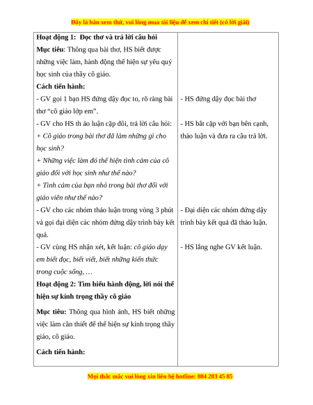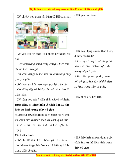 - Nêu được một số biểu hiện cửa sự kính trọng thầy giáo, cô giáo.