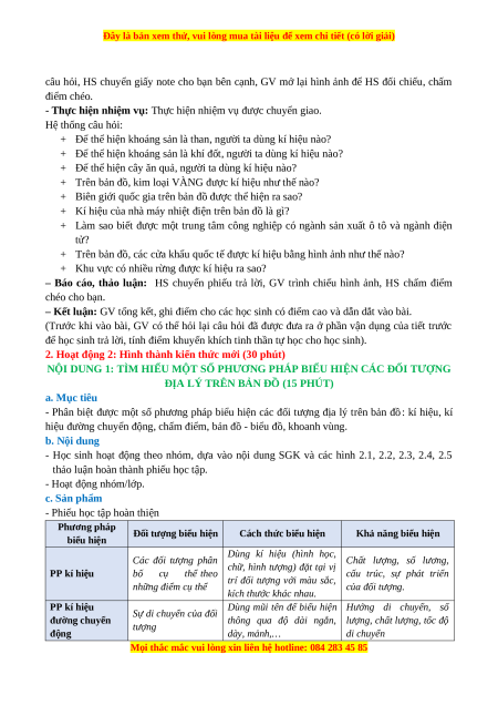 - Giáo án, 1 số bản đồ, tranh ảnh minh họa cho các phương pháp biểu hiện đối tượng trên bản đồ. - Phiếu học tập. 2. Học liệu - Bút màu. - Giấy note