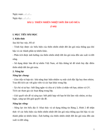 BÀI 2: THIÊN NHIÊN NHIỆT ĐỚI ẨM GIÓ MÙA (3 tiết)