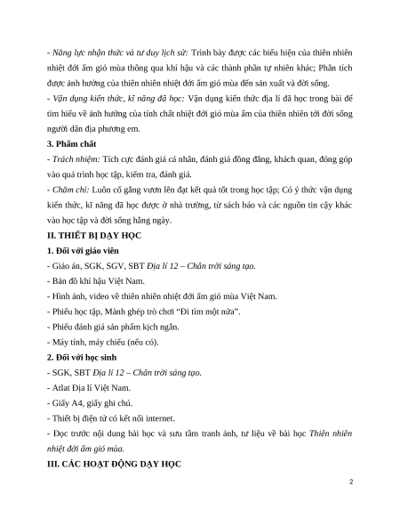 Giáo án Bài 2 Địa lí 12 Chân trời sáng tạo (2024): Thiên nhiên nhiệt đới ẩm gió mùa
