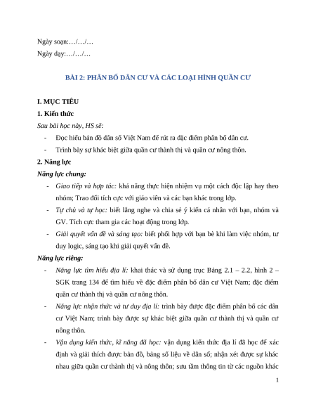 BÀI 2: PHÂN BỐ DÂN CƯ VÀ CÁC LOẠI HÌNH QUẦN CƯ I. MỤC TIÊU 1. Kiến thức