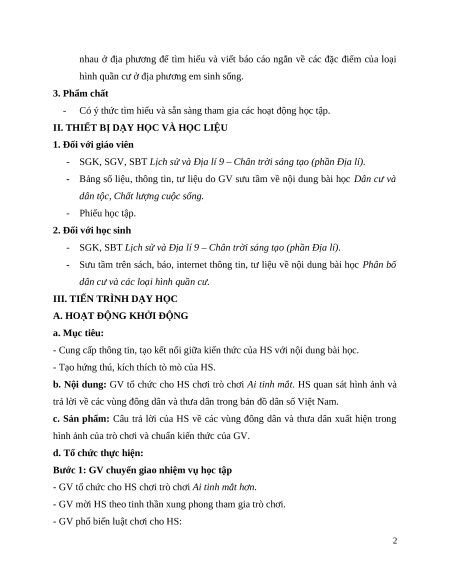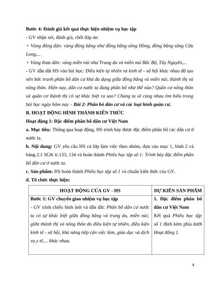 Giáo án Bài 2 Địa lí 9 Chân trời sáng tạo (2024): Phân bố dân cư và các loại hình quần cư